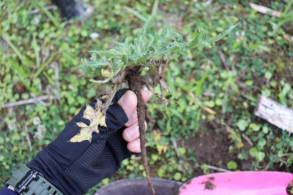 完全な防除を目指すには、周囲の土ごと掘り返し、文字通り「根こそぎ」取り除くしかありません。