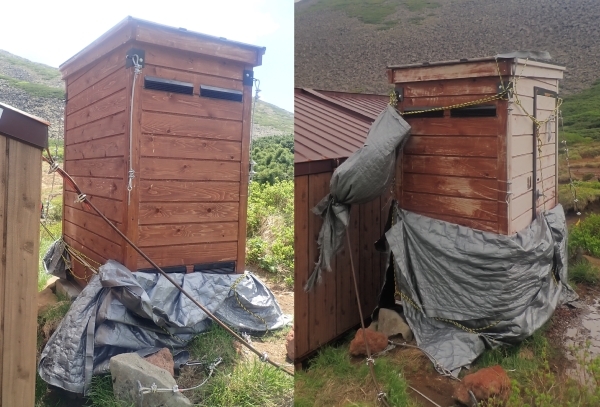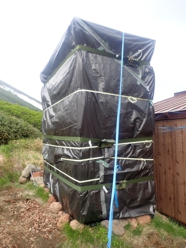 ブースは約7ヶ月もの間、雪に埋もれます。ブースを長持ちさせるため、毎年10月に冬囲いをしているのですが、山に吹く風はそう甘くありません。