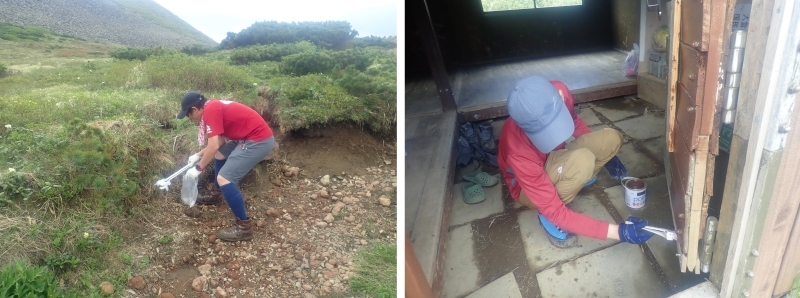 美瑛山岳会さんはシーズン中に何度も上がってきて小屋の補修や草刈りを行ってくださっています。この日はドアのペンキ塗りをされていました。