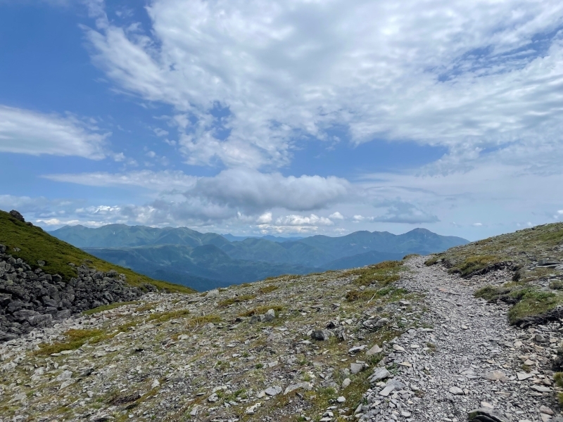 3日目、雨風がやや弱まる中、下山を始めました。稜線に上がれば風は強まります。未明の風がそのまま続いていたなら押し倒されていたかもしれません。南沼まで差し掛かると突然雲が切れ夏の陽を浴びる下界が目に入ってきました。ひとり下山中の登山者がもう一度登頂したいと引き返してくるほどの急展開でした。