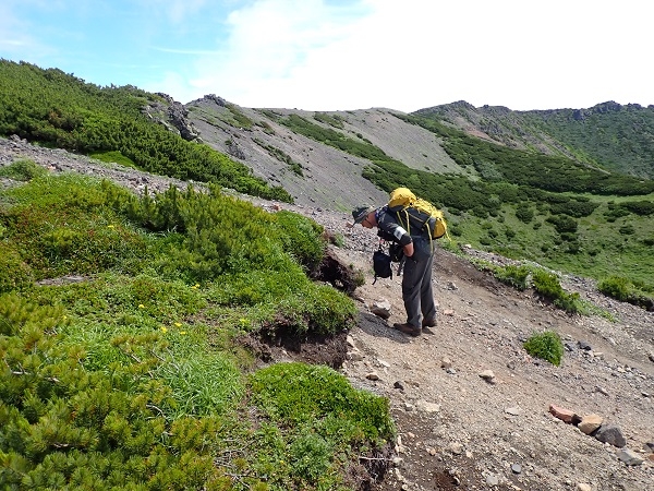 他の植物の群生地の外側、ハイマツの下を重点的にチェックしていきます。