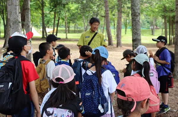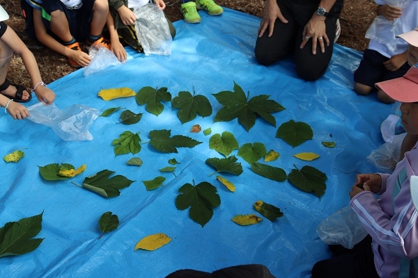 屋外での活動の注意点を説明した後、「お気に入りの葉っぱを2枚探そう!」という中村国立公園利用企画官の声かけのもと、それぞれが思い思いの葉っぱを選んで集めました。