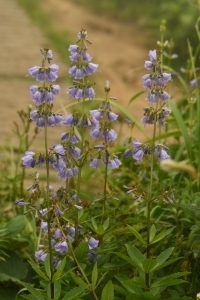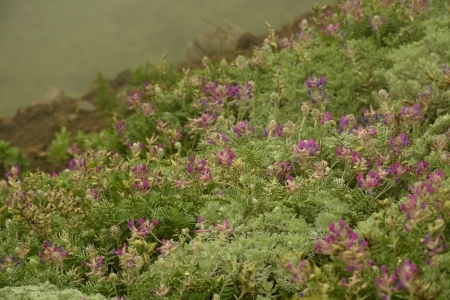 礼文島にだけ咲くレブンソウに出会えました。まだまだ花盛りで,全体に白い絹毛におおわれて,薄緑のじゅうたんのような中に,マメ科の紫の花が上向きに咲いていました。「初めまして!」と思わず声をかけていました。