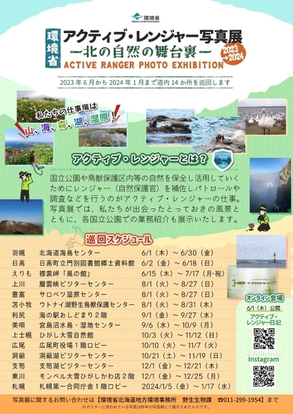 北海道内で働いている自然保護官補佐(アクティブ・レンジャー)12名と希少種保護増殖員1名が、それぞれ担当している国立公園や国指定鳥獣保護区内での業務紹介や、撮影した風景や生き物の写真を展示しています。