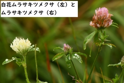 リンドウの仲間のハナイカリも島全体にたくさん咲いていました。それから,外来植物のムラサキツメクサの白花も見つけました。初めて見つけたので嬉しかったです。普通のタイプと並んでいるところを撮りました。