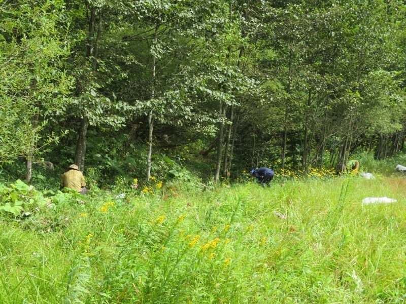 その後、周辺の林道で小群落の抜き取り防除に取り組みました。手鍬を奮って土中の根塊ごと掘り取ります。親指ほどの根塊が残っていると高い確率で再生するからです。昨年は1028本を抜き取りましたが、今年は740本でした。僅かな時間と人数で抜取り完了するよう、さらに生育数が減少していくことを望んでいます。