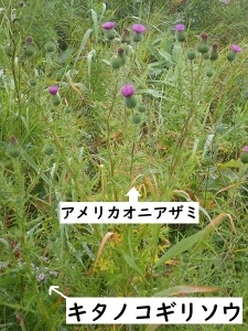大きく成長したアメリカオニアザミの根元には,島在来のキタノコギリソウが埋もれるようにひっそりと花を咲かせていました 。除去後は広い空間が開けて,何だか喜んでいるようにも感じました。