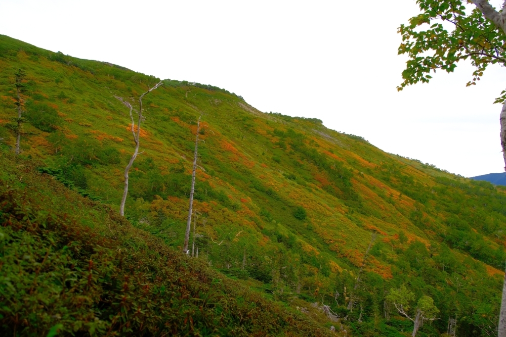 マイカー規制終盤には綺麗に紅葉した赤岳ですが、前半にはまだ夏の面影も随所に残していました。