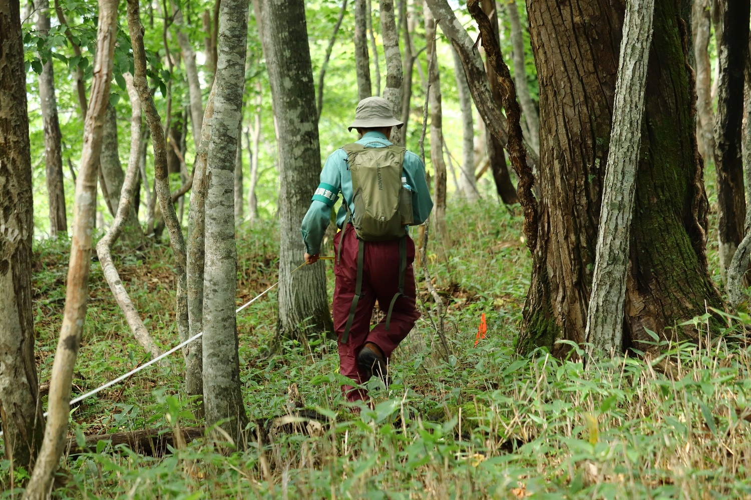 調査会社の職員が、森の中に目印や枠を設置し、植物がどれくらい食べられるかを測るための調査区を設定します。