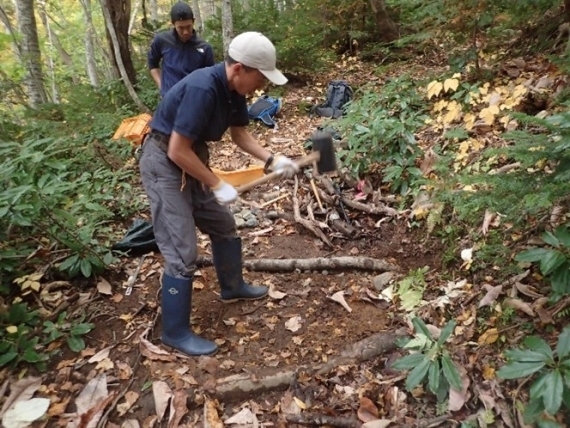 地面が柔らかすぎて木材がうまく埋め込めなかったり、逆に硬すぎて穴が掘れなかったり、かと思ったら穴を掘りすぎてしまったり…。想像以上に難しい!間違った施工をすると、逆に登山道や植生を壊してしまいます。そうならないように、水の流れを想像しながら作業を進めます。