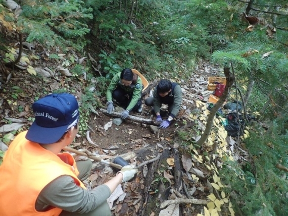 近自然工法では、自然にあるものを使って、より自然に近い状態に登山道を修復することを目指します。それによって、登山道だけでなく周囲の植生も回復するので土壌も安定し、施工したものがより長持ちする効果も期待できます。