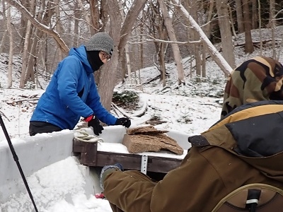 体重、体長、皮下脂肪の厚さ、歯のすり減り具合、腎臓周りの脂肪、妊娠・排卵の有無、胃の内容物、血液によるDNAサンプル採取など、様々な記録を取ってから運べる形に解体します。