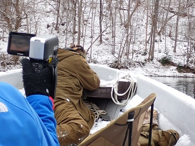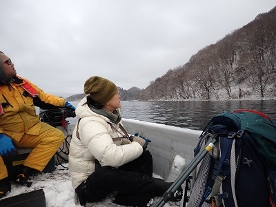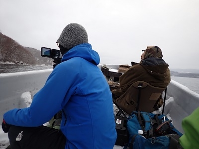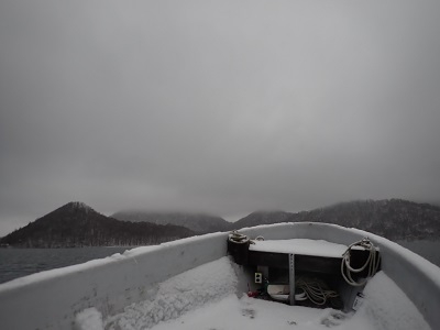 直前まで視界不良により実施が危ぶまれましたが、「出船してみて捕獲が難しいようであれば作業終了とする」との判断となりました。雪が降る中、和船に乗って中島に向かいます。