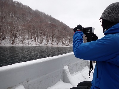 シカの捜索は目視、双眼鏡、サーモカメラなどで行います。葉が落ちているとは言え、まだ雪の少ない斜面にいるシカを探し出すのは至難のわざです。また船が揺れて狙いが定められなくなることを防ぐため、極力体重移動をしないよう気を配ります。