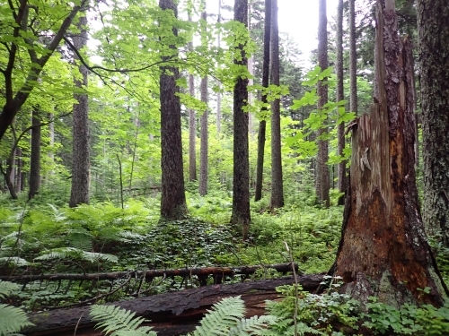 また、アカエゾマツが倒れてできた隙間には日が当たるようになり、コシアブラやホオノキやなどの広葉樹が伸びてきているのが見て取れます。