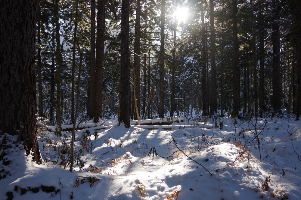 冬はアカエゾマツに積もった雪が日の光を反射しながらゆっくりと降り落ち、幻想的です。