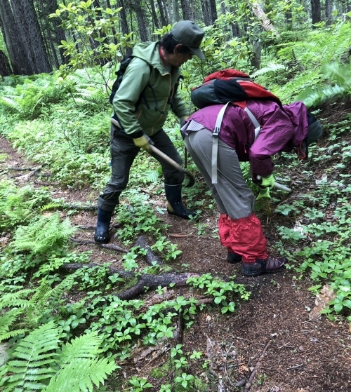 ササ刈りは探勝路にかかったササのみを手鎌で刈っており、必要以上に植物を傷つけないよう配慮しています。
