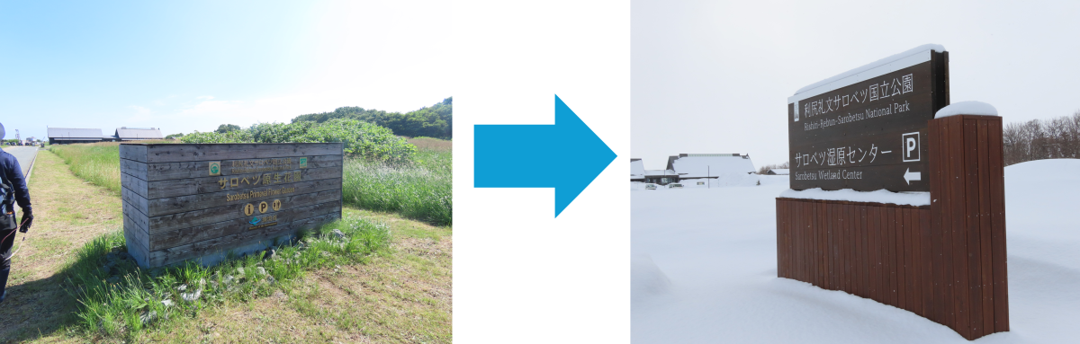 サロベツ湿原センター 駐車場入口の旧看板(左)と新看板(右)