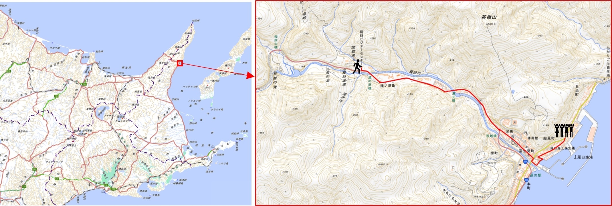 知床半島の西側、斜里町ウトロから知床横断道路を越えて町から町を繋ぎたかったのですが、企画調整中、知床峠頂上付近にヒグマが複数滞留しているという情報がありましたので、安全第一で今回は徒歩での通過は諦めました。
