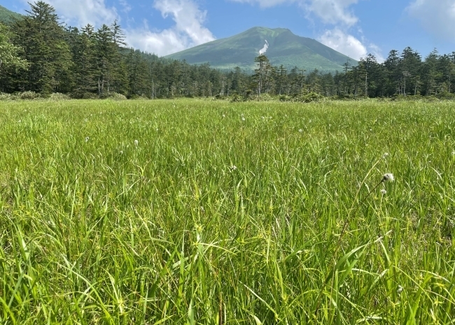 原始ヶ原は、十勝岳連峰の南端、標高1,000mから1,300mにわたって広がる高層湿原です。草原が広がりアカエゾマツなどの森が囲んでいます。大雪山には、沼ノ平や沼ノ原、黄金ヶ原などの湿原がありますが、原始ヶ原は中でも大きな広がりを持っています。ほかに比べて池や沼が少なく、どこまでも緑が広がって見えます。マツの濃い緑やカヤ類の明るい緑が躍動しています。湿原が人の立ち入りを拒み、その名のとおり原始の世界が残されています。