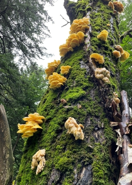 取りついた樹種はヤチダモでしょうか。太く真っすぐな幹はそう思わせますが、ハルニレやニレの木にもよくつくようです。今は苔むして見る影もありません。原木が立ち枯れ、あるいは倒木となると、素早く菌糸を張り巡らせます。原木は、養分を吸い尽くされると形を失い崩れていきます。よく見ると、タモギタケもまた小さな虫たちに食いつかれています。