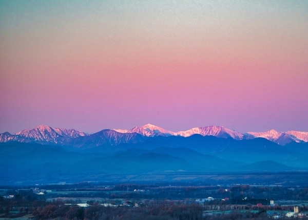 十勝平野から眺める日高山脈は格別です。十勝平野から日高山脈の南北100km近く一望できる場所があり、初冬の朝、吐く息が白くなり始める季節になると、澄んだ空気はピリッと張り詰め、日高山脈を映し出します。そんなときに現れたのが「ビーナスベルト」と言われる自然現象です。