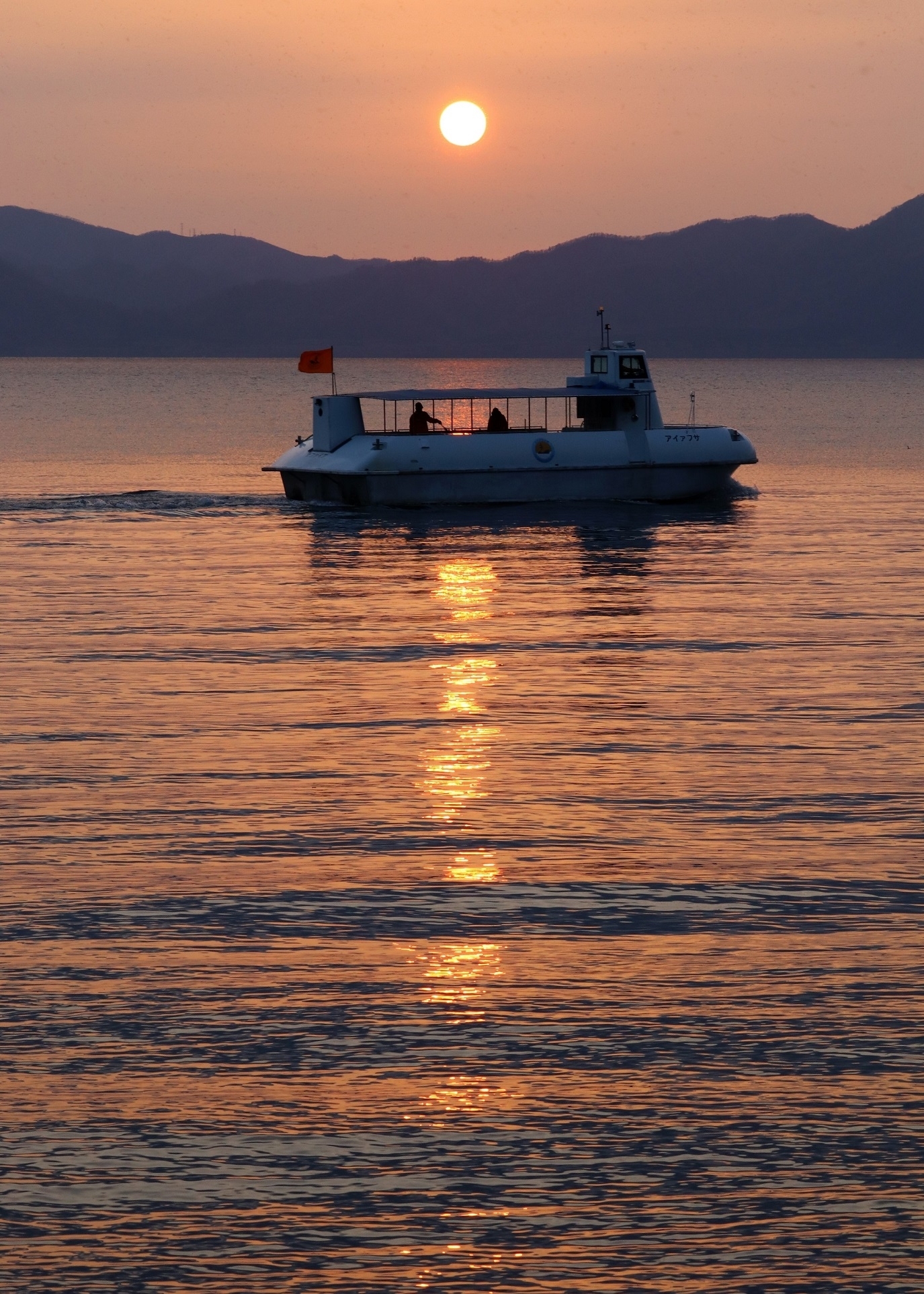 支笏湖周辺の木々が色づき、秋たけなわとなった10月31日、夕陽で赤く染まった湖面を船が渡ってゆく風景に出会いました。