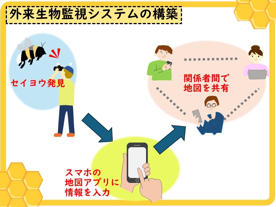 また、これまでのモニタリングではマルハナバチを発見したら一頭一頭、手書きで紙に情報を書き込んでいましたが、今年度からスマートフォンのGISアプリに目撃情報を登録し、関係者間でリアルタイムな情報を共有できるようにもなりました。