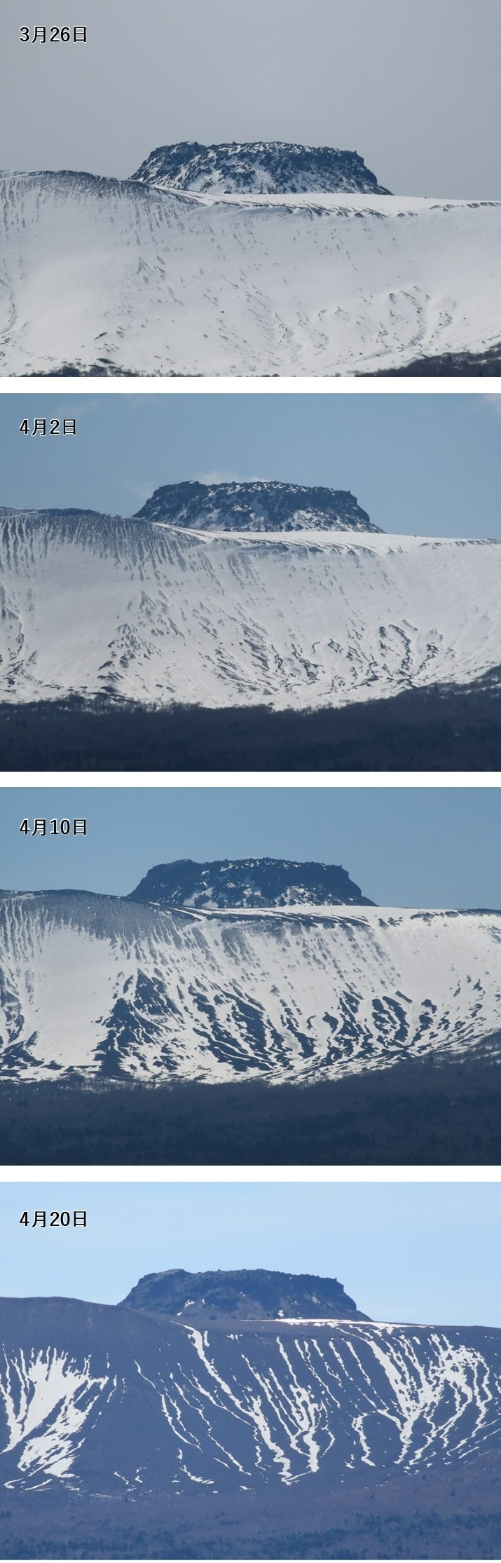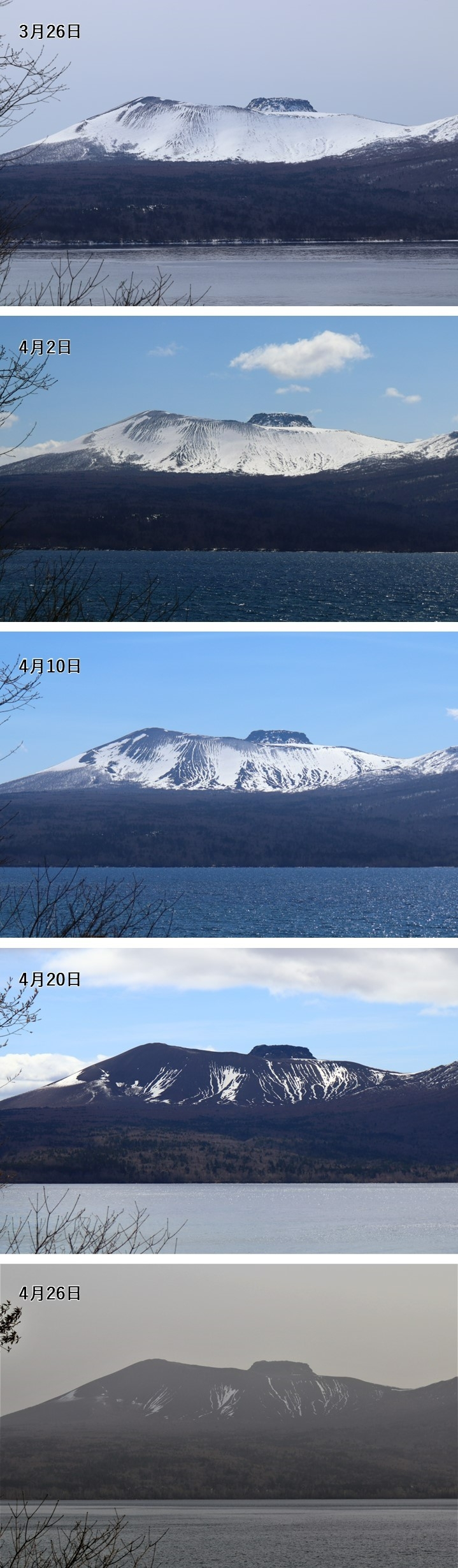 火山活動の影響で樽前山の森林限界は低いため、日当たりがよく、4月の変化は劇的です。