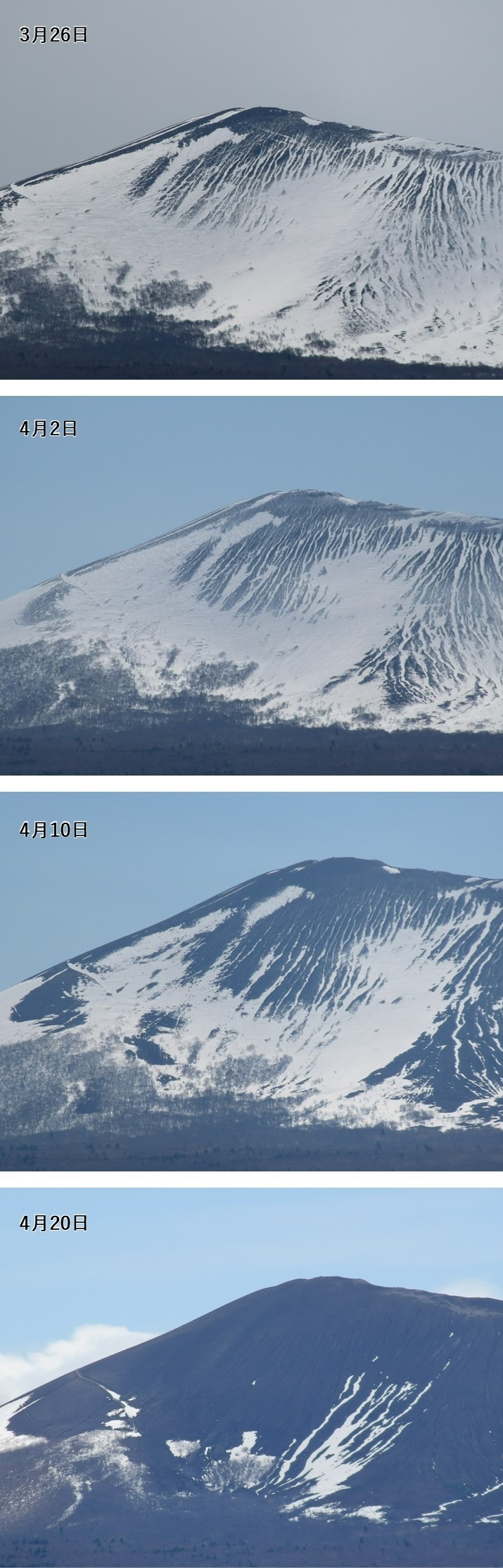 今日は、その中でもひときわ特徴的な形をし、山頂の溶岩ドームから蒸気を上げている活火山の樽前山について、3月末から4月にかけて撮影した雪どけの様子を紹介しようと思います。