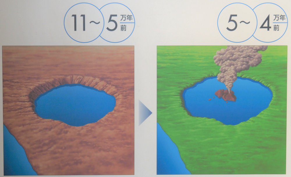 洞爺湖と中島の形成過程を簡単に説明すると、まず約11万年前に洞爺カルデラが形成されました。その後、約5万年前に噴火が再発し、カルデラ中央に中島溶岩ドーム群が誕生しました。それが現在の洞爺湖中島です。