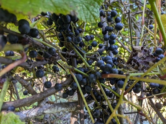 一見似ていますが、ヨウシュヤマゴボウは茎が赤いので見分けやすいですね。有毒なので食べられません。一方ヤマブドウは食用にされていますね。中島は無人島で、しかもクマがいないのでたくさんありました。