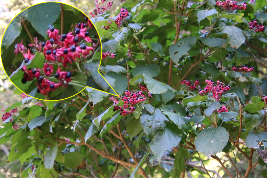 クサギ:樹林の中で鮮やかな色で目立ちます。独特なにおいはありますが、毒はなく、食用や薬用、染料として利用できます。