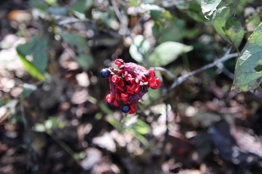 ヤマシャクヤク:白い花からは想像もつかない赤い種子。赤は結実していない部分で、黒が結実した部分。名前にシャクヤクが入っていますが薬効はなく、山に生えシャクヤクに似ているところが由来のようです。