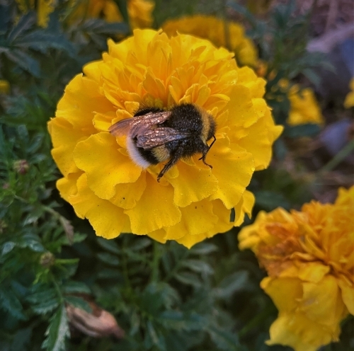東川町で初霜が下りた日の早朝、飼い犬の散歩中にセイヨウオオマルハナバチ(以下「セイヨウ」という。)の働きバチがご近所の庭先のマリーゴールドの上で力尽きているのを見つけました。
