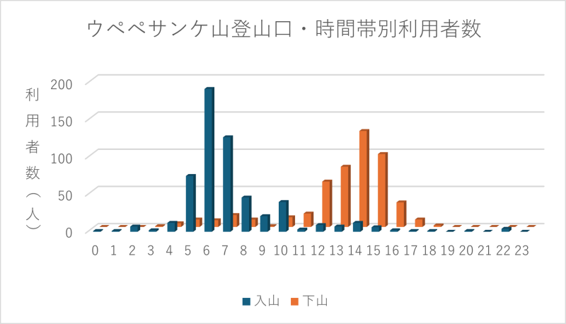 まずは、時間帯別に入下山の利用者数を棒グラフにしてみました。