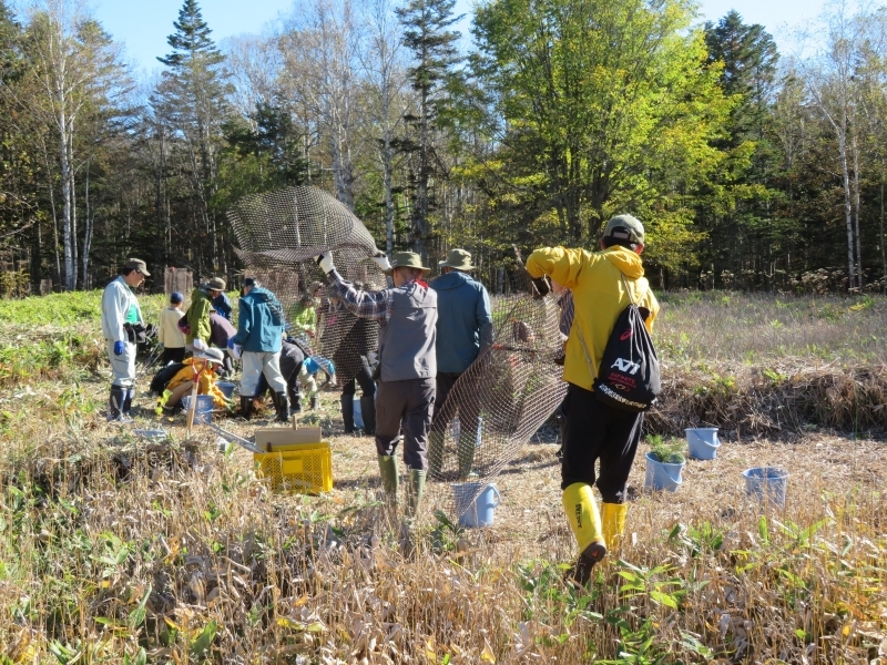 環境省は一帯を所管地とし、上士幌管理官事務所では小中学校跡地を中心に、植樹や自生樹木の食害防止など森に還す活動を続けています。植樹は、ひがし大雪自然館と共催のイベントとして参加者を募り、毎年の秋に針葉樹と広葉樹の稚樹20本ほどを植えています。近くの国道脇から、いずれ管理のため刈り払われてしまう稚樹を掘り取り移植しています。針葉樹は主にトドマツ、広葉樹はカバやヤナギ、ハルニレなど、小中学校跡地の周辺にも見られる種類です。