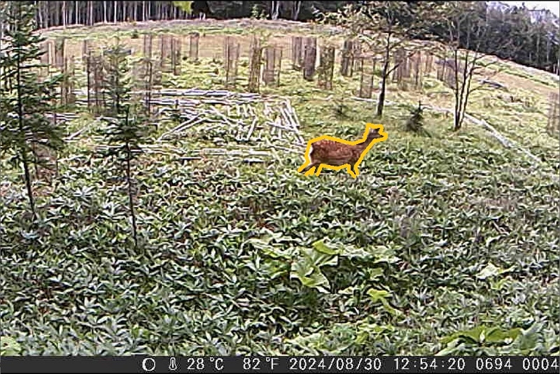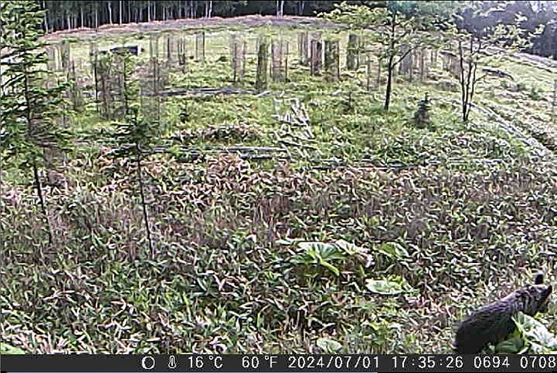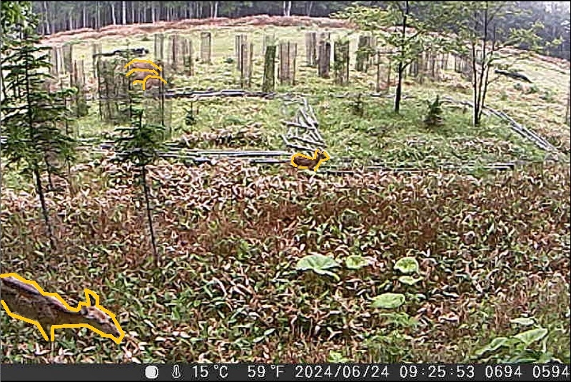 松製材で囲んだふたつの区画とその周囲を見渡す位置にセンサーカメラを設置し、鹿の行動を観察しました。画像の右側を北ゲート、左側を南ゲートとします。期間は5月下旬から8月末まで。静止画ですと分かりにくいので、10秒の動画で記録しました。居座る鹿をとり続けては保存容量が持たないので、10分のインターバルを開けて次の検知に進むよう設定しました。