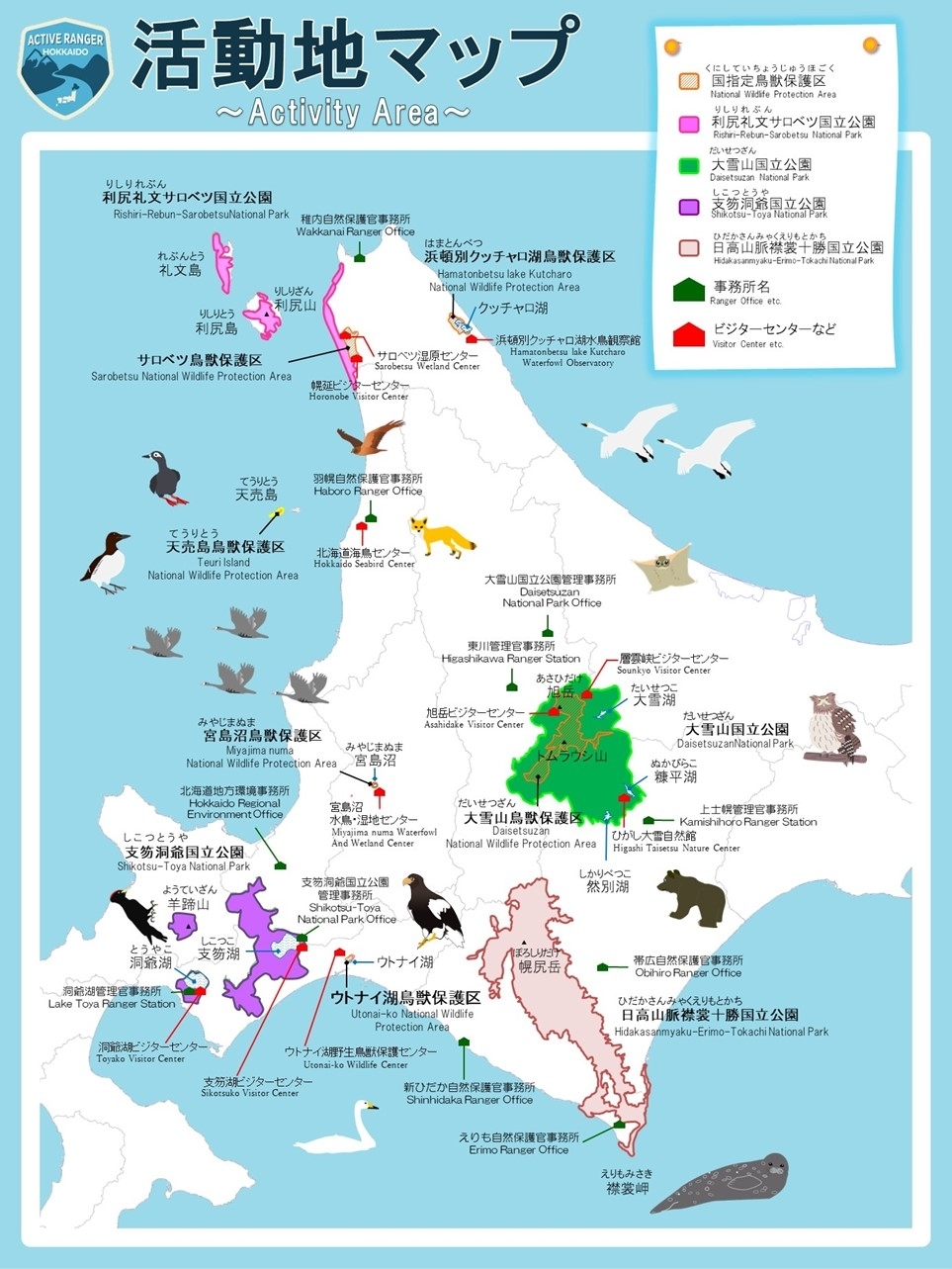 写真を通して北海道各地の自然が持つ素晴らしさや、私たちが取り組む業務について知っていただけましたら幸いです。 アクティブ・レンジャーの活動地(マップ)はこちら!(クリックするとご覧いただけます。)
