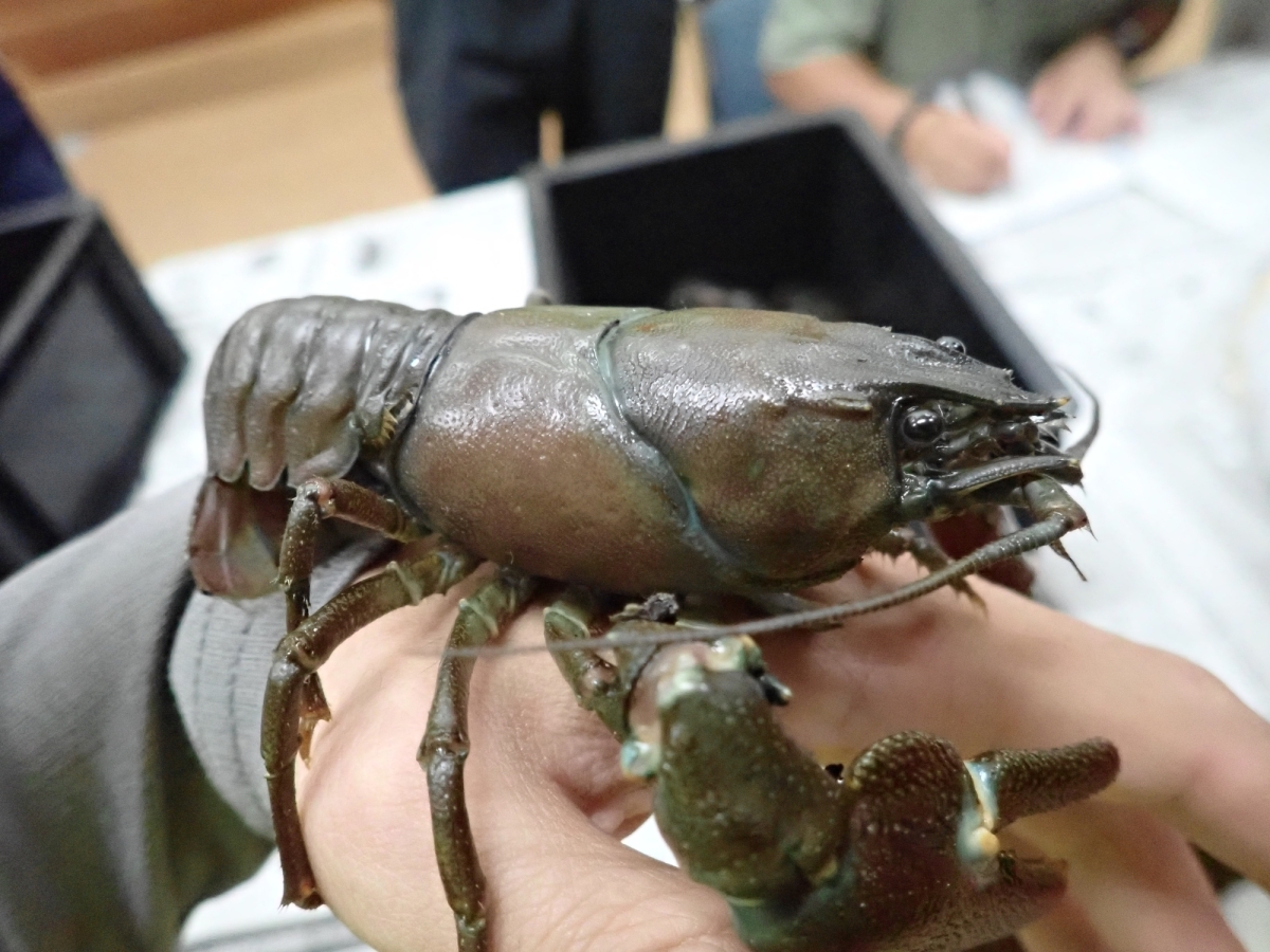 日本人研究者が由来の(和名)ウチダザリガニさんだが、英語圏ではハサミの淵が白いという特徴から“Signal crayfish”と呼ばれているらしい。
