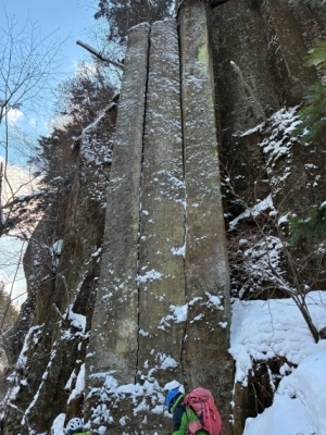 右の写真では、柱状節理の岩壁から柱状の岩体が途中で抜け落ちた様子が見られます。こうした岩壁では、岩の外側と内側で季節による温度差が生じ、夏には表面が温まって膨張し、冬には冷えて縮むことで、柱状の岩体がわずかにたわみを繰り返します。