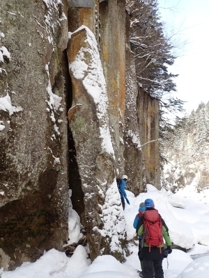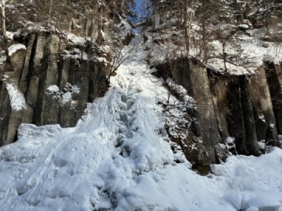普段はニセイチャロマップ川と石狩川が流れていますが、冬期は上流の取水堰が取水している関係でほとんど水が流れていないため、層雲峡を代表する柱状節理の岩壁を間近で観察しながら歩くことができます。