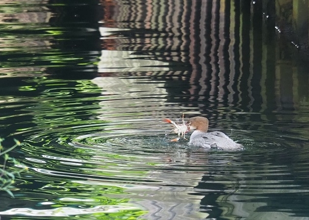 洞爺湖畔での出来事です。水鳥のカワアイサが、ウチダザリガニを丸のみしようとしています。