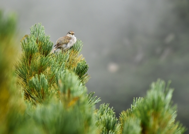 ウグイスのさえずりが山に響き渡るのは珍しいことではないのですが、姿が見られることはめったにありません。ところが、この日はどうしたことか、登山道のすぐ横のハイマツのてっぺんに留まり、一生懸命メスを縄張りに誘っていました。よく見ると毛がまだフワフワとしているので、今年巣立った幼鳥のようです。繁殖シーズン も終盤なので、大胆に最終アピールの策に出たのでしょうか。