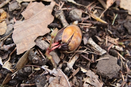 昨年、ドングリが豊作だというニュースは、見た方も多いのではないでしょうか。今年は、発芽しているドングリをよく見かけました。触ってみるとドングリの芽は、堅くて枝のようでした。