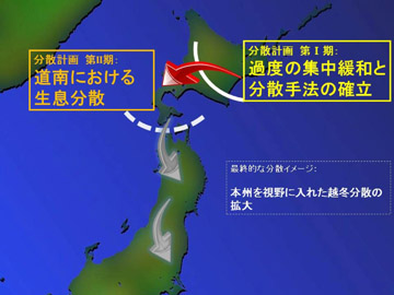 - 方向性を持った越冬分散(現行給餌場外への分散、道央・道南への分散、本州への分散手法等検討)