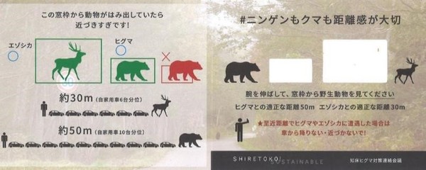 「知床ディスタンスカード」(ヒグマは50m以上、エゾシカは30m以上距離を取る)