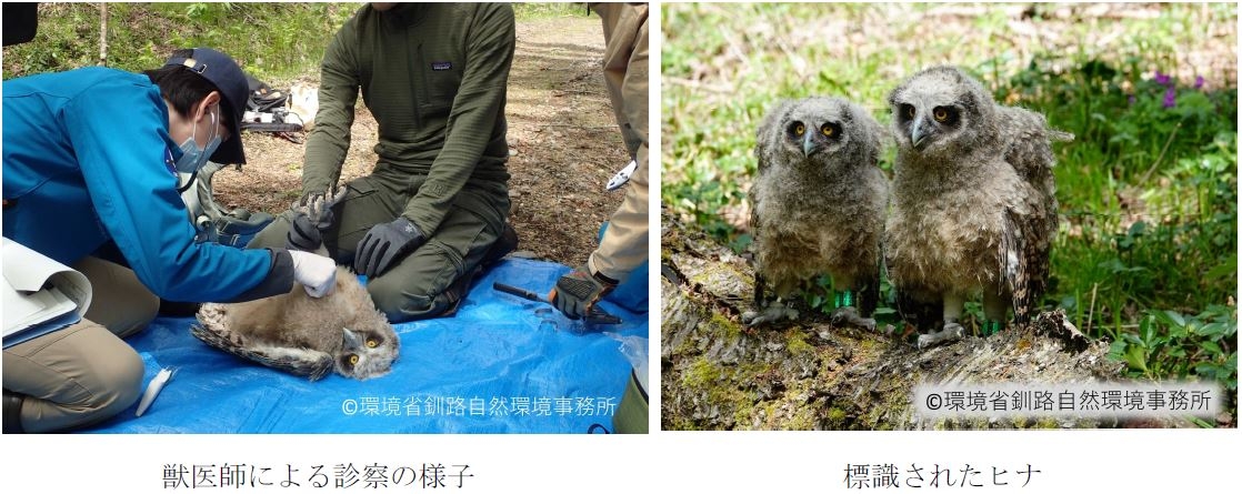 ・環境省では、シマフクロウの保護増殖事業の一環として、春に生まれたヒナに足環標識を装着し、個体識別、性別・来歴等の個体情報の収集、繁殖履歴の把握等を行っています。