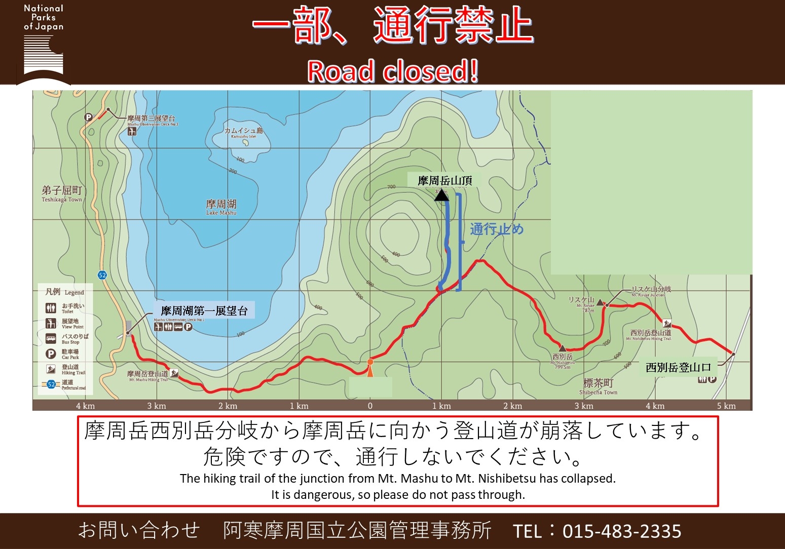 摩周岳山頂直下で登山道が流出しており安全な通行が出来る状態にないため、分岐から山頂に至るルートを通行止めにしています(詳細は添付資料のとおり)。