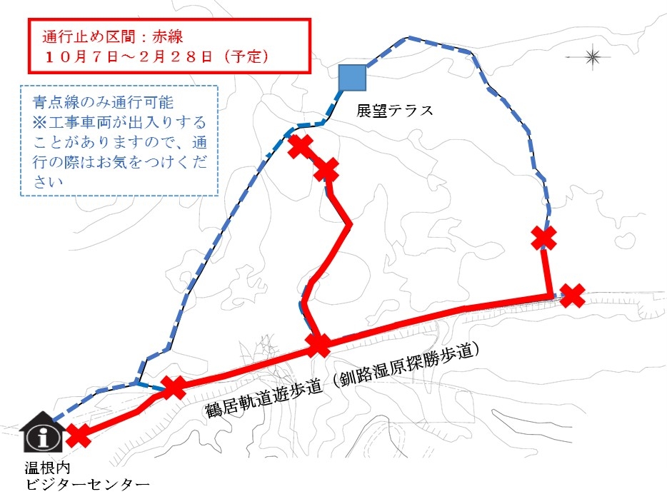 1.釧路湿原国立公園温根内(阿寒郡鶴居村温根内)において、木道の改修工事を行うため、一部で通行止めを実施します。